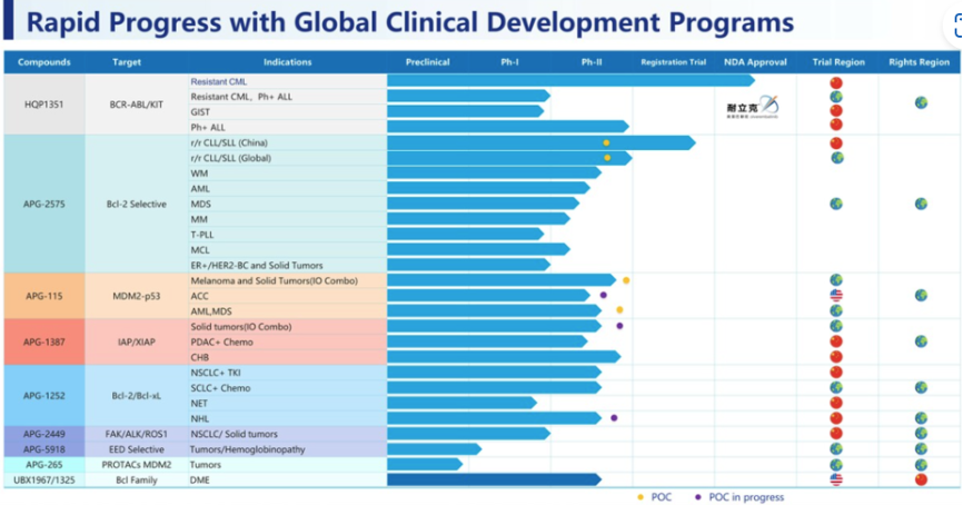 其中,细胞凋亡管线重磅产品APG-2575,已经在全球范围内开展19项临床研究,其中治疗复发/难治性慢性淋巴细胞白血病/小淋巴细胞淋巴瘤的关键注册2期临床试验,已完成首例患者给药。