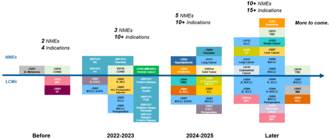 2024-2025年,君实生物预计将有5个新分子实体获批上市,包括抗PCSK9单抗、抗BTLA单抗、抗IL-17A单抗、靶向EGFR exon 20的JS111等。