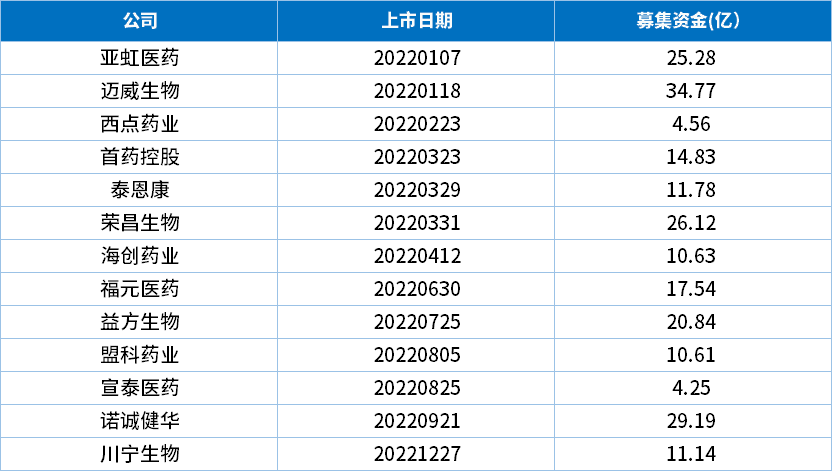 本文选取2022年在A股IPO的13家创新药企进行综合分析。分别是亚虹医药、迈威生物、西点药业、首药控股、泰恩康、荣昌生物、海创药业、福元医药、益方生物、盟科药业、宣泰医药、诺诚健华、川宁生物。