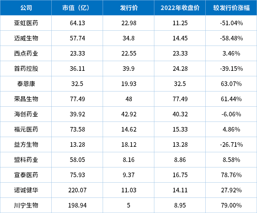 以2022年12月30日收盘价计,共有5家跌破发行价。其中迈威生物、亚虹医药跌幅超过50%,与之对应的市值也大幅腰斩。