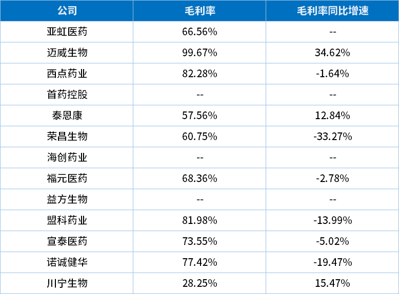 毛利率反映一家公司盈利空间和综合竞争力,13家公司中毛利率最高的是迈威生物,达99.67%,同比增长34.62%。