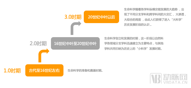 现代生命科学,是经过漫长的历史阶段而逐步发展形成的。按照所采用的主要工具复杂性、完整性和主流学术分支出现的节奏,通常可以将生命科学的历程总结为3大主要阶段。