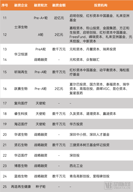2022年,国内共有22家再生医学创新企业完成融资。其中,血霁生物、士泽生物、华卫恒源均在1年内快速完成2轮融资。在这个过程中,红杉资本、礼来亚洲基金、北京广创投、鼎晖投资、启明创投等医疗创新领域的顶级投资机构纷纷出局。机构哄抢之下,血霁生物、士泽生物两家成立不久的再生医学企业估值迅速攀升,成了这一年度的再生医学明星企业。
