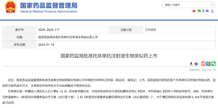 1月16日,国家药监局官网信息显示,百奥泰生物制药股份有限公司(简称:百奥泰)申报的托珠单抗生物类似药(商品名:施瑞立)获得批准上市,用于治疗成人类风湿关节炎、全身型幼年特发性关节炎和细胞因子释放综合征。