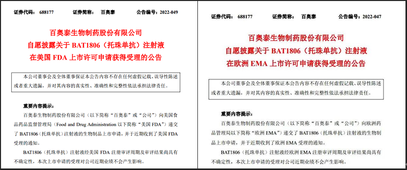 除此之外,2022年12月,百奥泰公告,该药的生物制品许可申请(aBLA)获美国FDA受理。在此之前,2022年9月,BAT1806/BIIB800 的上市许可申请(MAA)已获欧洲药品管理局(EMA)受理。
