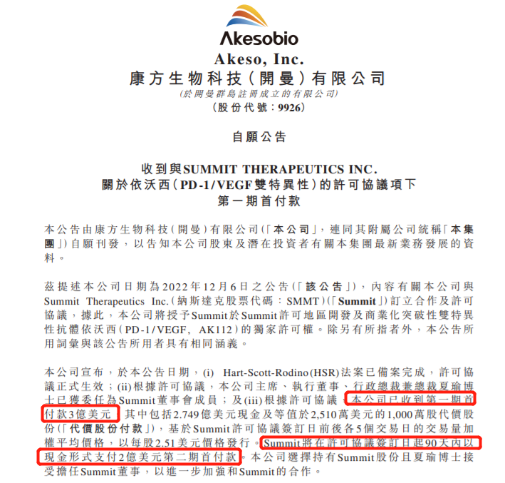 2023年1月26日,康方生物宣布收到美国Summit Therapeutics(Summit)公司就依沃西(PD-1/VEGF双抗,AK112)合作的第一期3亿美元首付款,包括2.749亿美元现金及等值于 2510万美元(1000万股)Summit公司的股份。