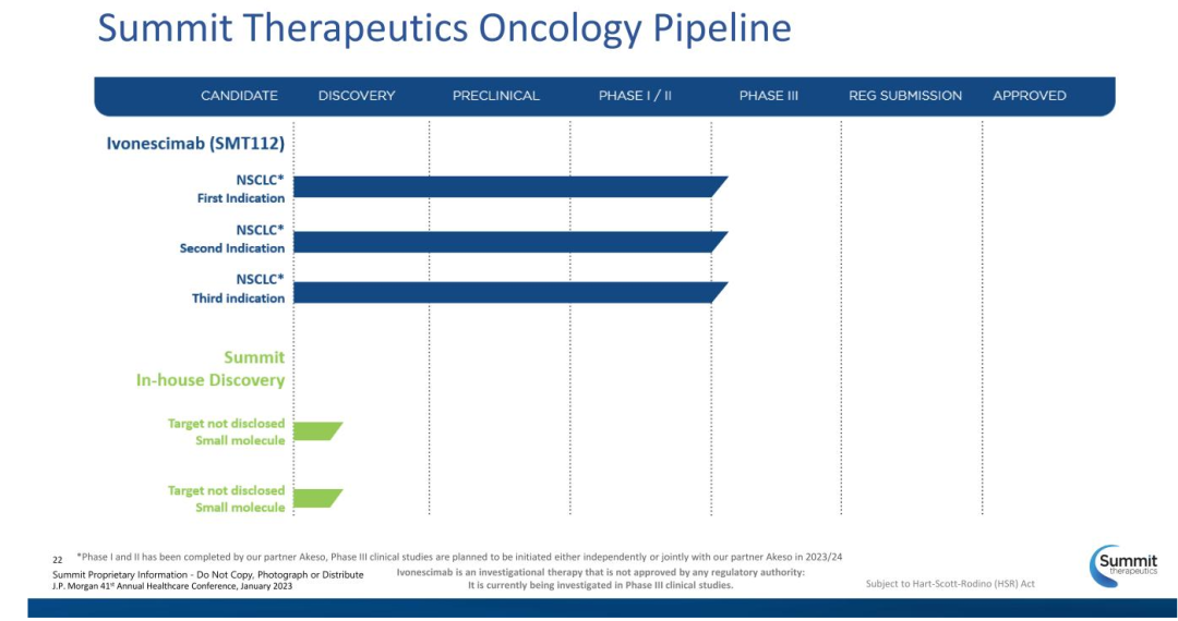 目前,依沃西已经被Summit作为主要核心资产,尽全力推进该药物在授权国家的临床开发。在今年1月初2023 年JP摩根年会中,Summit Therapeutics的实控人、医药界传奇人物Bob Duggan透露,公司当前已完成资金和团队准备,全力推进PD-1/VGEF双抗在美国等的开发进程,将在2023年-2024年启动3项Ⅲ期临床注册研究。