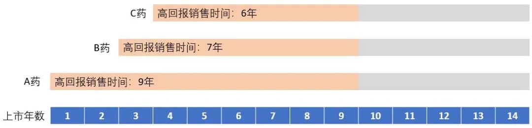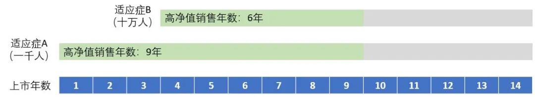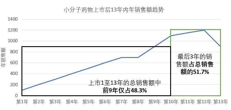 但9年太短了,虽然它只比13年短了30%,但药物的销售额并不是平均分配在每一年的。当一个创新药进入市场,市场需要时间来逐步验证和接受这个药物,它的销售额是随着时间逐渐攀升,一般在10年才达到峰值,因此1-9年的实际销售额甚至不到总销售额的50%,而大部分的销售额实际恰恰来自被砍掉的那4年。