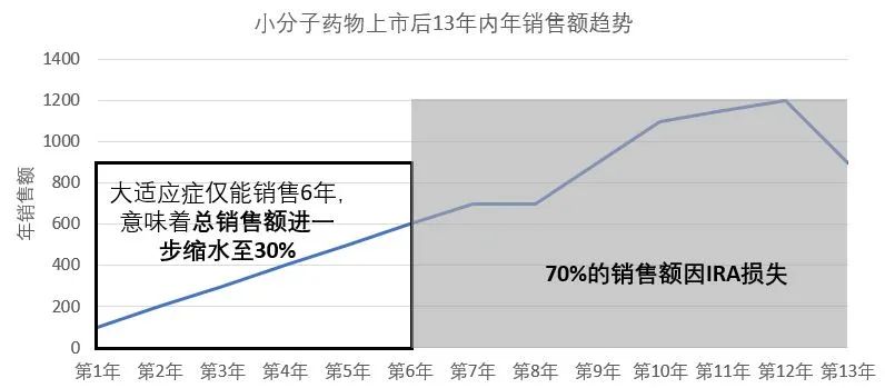 13年对于制药企业来说也许是可以接受的,因为就算没有IRA,一般创新药在上市后的14年也会由于专利到期,仿制药大量上市,失去市场独占权,而经历销售额的大幅下降,这被称为“专利悬崖”。