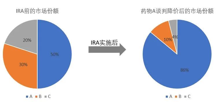A、B、C三种药物也许在定价和销售策略上也各有不同,医生和患者可以根据需求酌情选择,因此假设三种药物都达到峰值销售额后的市场稳态大概是,A药50%市占率,B药30%的市占率,C药20%的市占率。如果没有IRA,A、B、C三种药物会在A上市后的14年被A药的仿制药冲击,失去大部分市场份额。