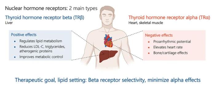 Resmetirom是一款靶向肝脏的潜在“first-in-class”甲状腺激素受体(THR)-β口服选择性激动剂。甲状腺激素通过激活肝细胞中的β受体,在肝功能中发挥核心作用,影响从血清胆固醇和甘油三酯水平,到肝脏中脂肪病理性积聚等一系列健康参数。THR-β受体在肝脏中的作用是肝脏正常功能的关键。Resmetirom具有高选择性,能够避免激活介导肝脏外(包括心脏和骨骼)甲状腺激素活性的THR-α受体,并且在肝脏部位被特异性摄取。