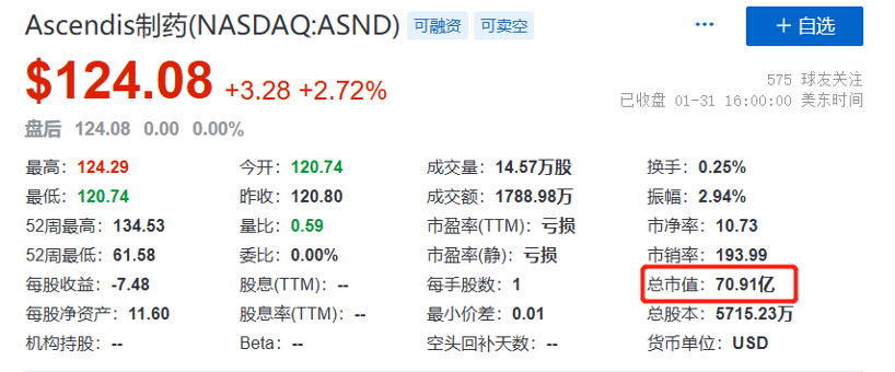 在2022年的资本寒冬中,Ascendis比其他biotech公司更好地度过了这一年。从股市变动来看,过去12个月中Ascendis仅出现了个位数的百分比下滑,其市值仍保持在70亿美元左右。