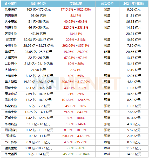 从已披露业绩的医药企业来看,预计净利润超过10亿元的有25家,其中,九安医疗最高达175亿元,药明康德、人福医药、济川药业、科伦药业、昭衍新药、凯莱英等均创新高。在预喜企业中,涉及中药、CXO、医疗器械等热门板块,而这里面不乏安旭生物、硕世生物、亚辉龙等科创板企业的身影。