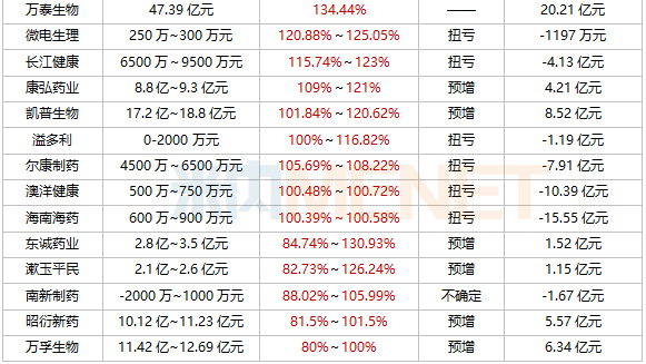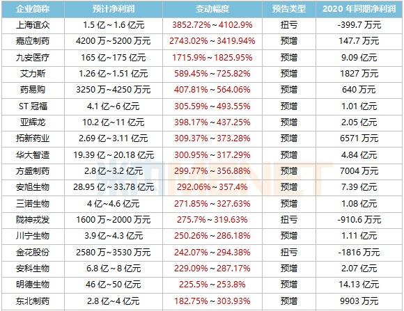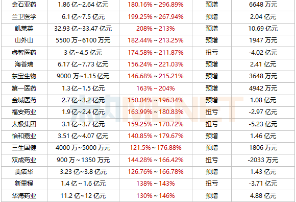 从增幅来看,超过40家企业翻倍,其中,上海谊众、嘉应制药、九安医疗涨幅超10倍;太极集团、福安药业、尔康制药等14家扭亏为盈。此外,有90家亏损,亏损主要涉及商誉减值、疫情等因素。