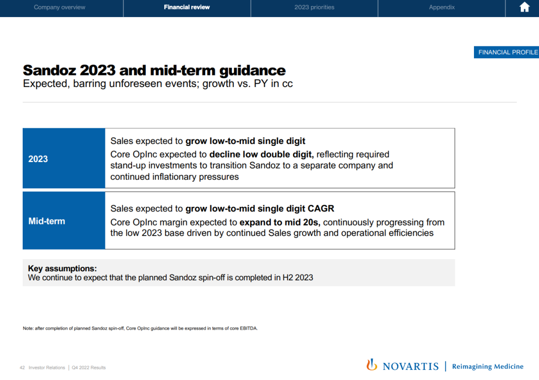 本次诺华也单独将山德士的 2023 年以及中期财务指导分离出来。预计山德士 2023 财年销售额增长中低个位数百分比。