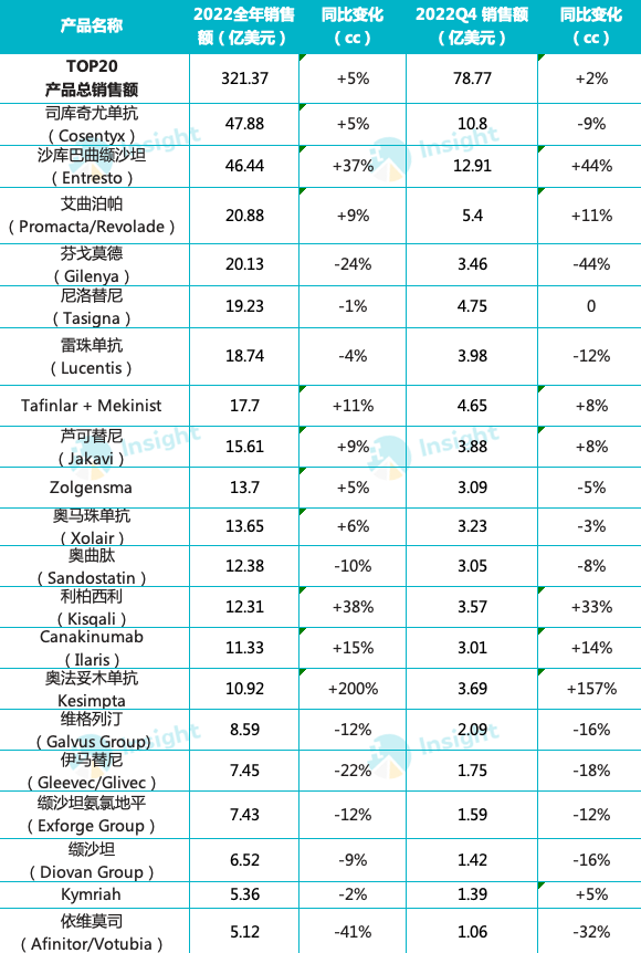 2022 全年诺华 TOP20 创新药销售额情况