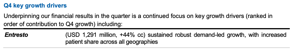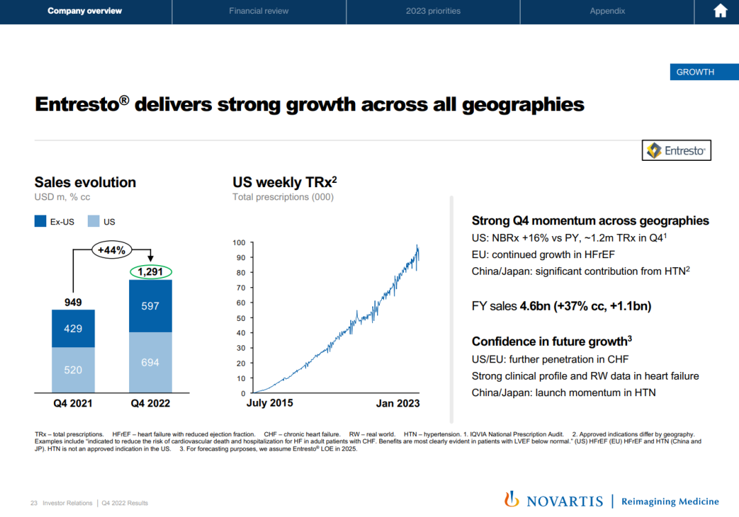其中,沙库巴曲缬沙坦(Entresto)是诺华布局心血管领域的核心产品之一,不仅位列 2022 全年销售额增长前三,同时也为 2022 Q4 业绩增长作出很大贡献(同比 +44% cc)。沙库巴曲缬沙坦在所有地区的患者份额均有增加。据估计,约有1000 万患者正在采用沙库巴曲缬沙坦治疗。