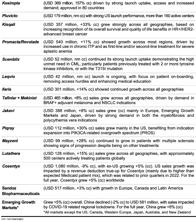 单从 2022 Q4 来看,诺华产品净销售额 126.9 亿美元(同比 +3% cc),营收 19.49 亿美元(-14% cc)。Q4 业绩增长主要来源于沙库巴曲缬沙坦、奥法妥木单抗、利柏西利(Kisqali)、艾曲泊帕(Promacta/Revolade)、Canakinumab(Ilaris)等多款产品的贡献。
