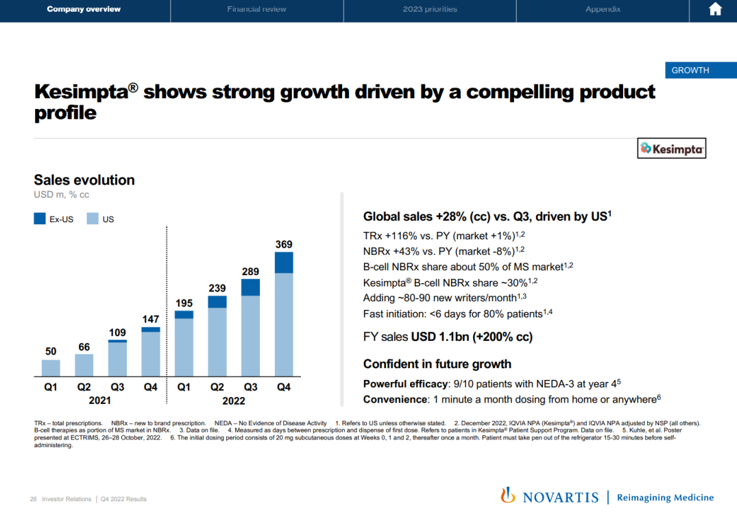 奥法妥木单抗(Kesimpta)2022 年销售额表现出强劲的增长趋势,Q4 同比增长 157%(cc);奥法妥木单抗是一款靶向 CD20 双表位的抗体药,于 2021 年在国内获批上市,且已经在中美欧日获批多发性硬化和慢淋适应症,每周一次皮下注射给药在依从性方面带来优势。