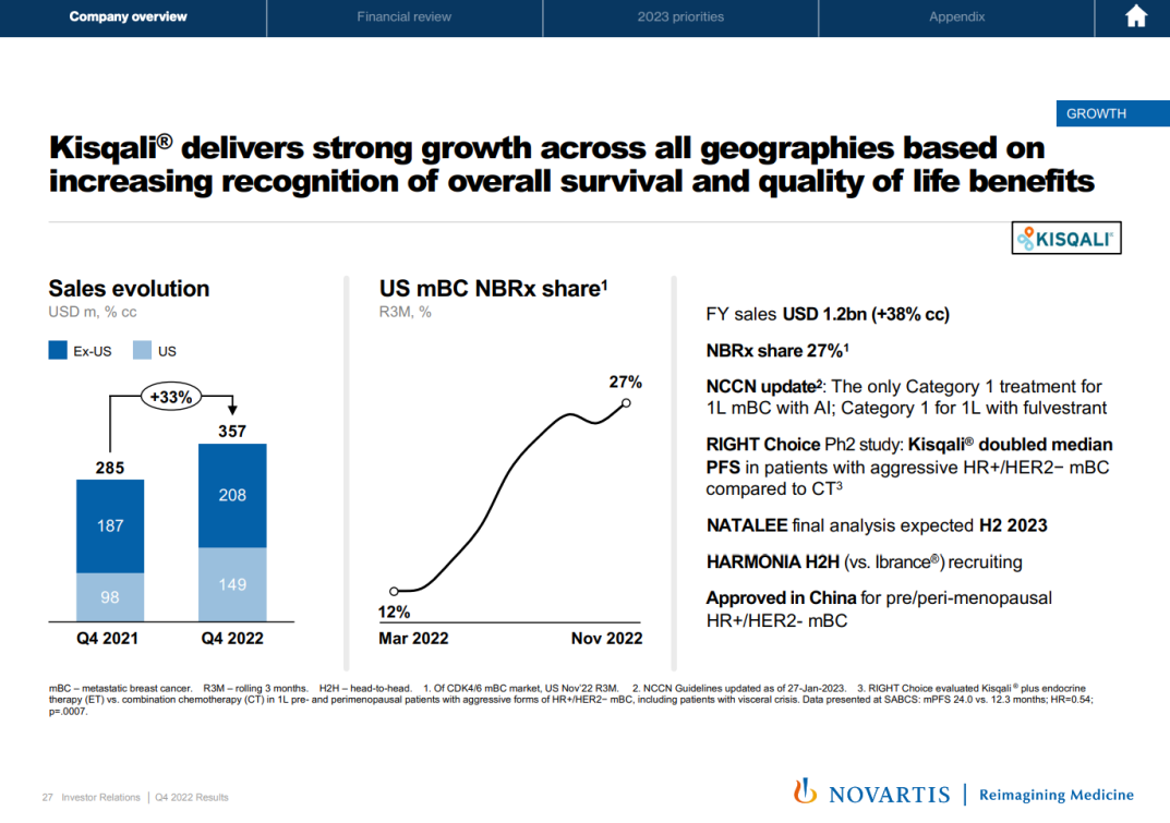 CDK4/6 抑制剂利柏西利(Kisqali)在全区域保持强劲增长态势,Q4 同比增长 33%(cc)。其辅助治疗 III 期临床 NATALEE 研究预计将在 2023 年下半年数据读出。