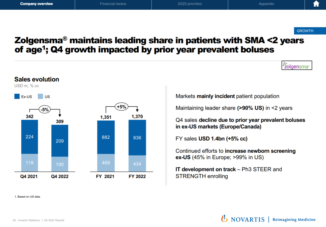 罕见病用药 Zolgensma 2022 全年销售额增长 5%(cc),然而 Q4 销售额却下降 5%(cc)或与其之前安全性相关负面消息有关。Zolgensma 是一款用于脊髓型肌萎缩症(SMA)的基因疗法,目前已在全球 47 个国家或地区推出。