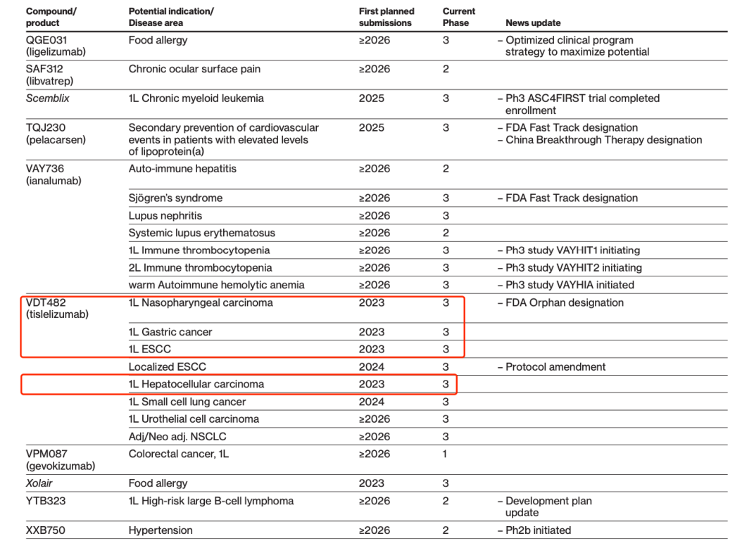 值得一提的是,本次年报,诺华还披露了与百济合作的 PD-1 替雷利珠单抗的相关研发计划,预计将于 2023 财年达成 4 项里程碑。