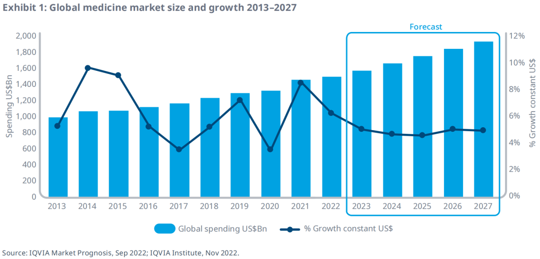 2022年,全球药品支出大约为1.48万亿美元(不包含COVID疫苗和疗法相关费用),预计到2027年全球药品支出将以3-6%的年复合增长率(CAGR)增长,至2027年,全球药品支出将达到1.9万亿美元。