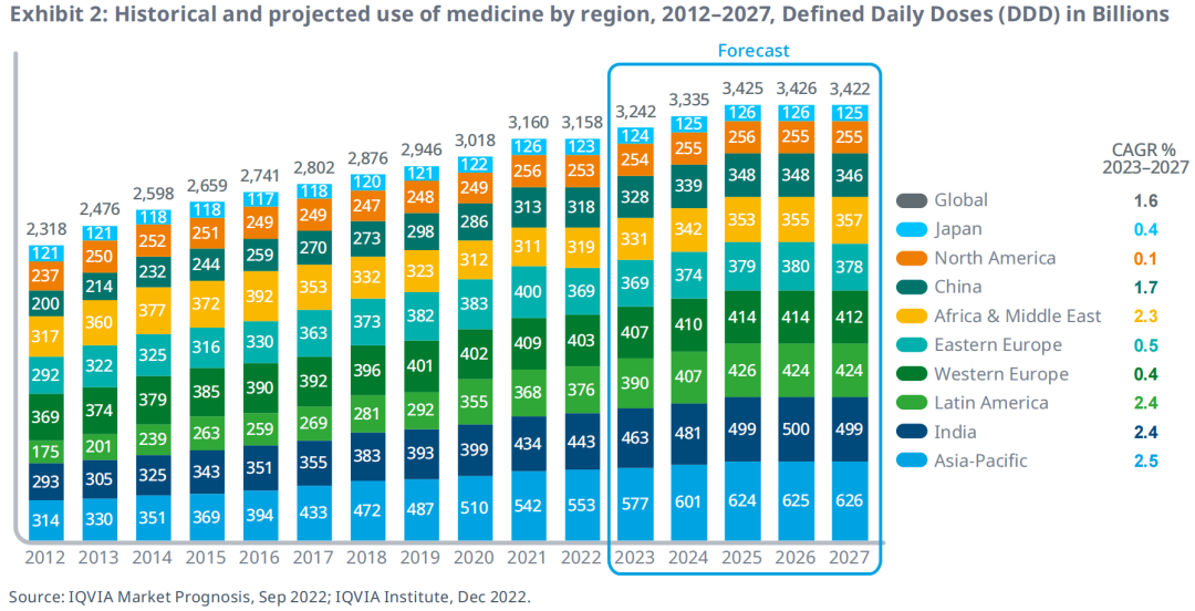 在过去十年中,全球药物的使用量一直在增长;然而,预计未来五年全球各大市场的增长都将放缓。由于疫情的滞后效应,药品用量在2021年急剧增长,并在2022年因一些使用与需求的临时变化而放缓增长。