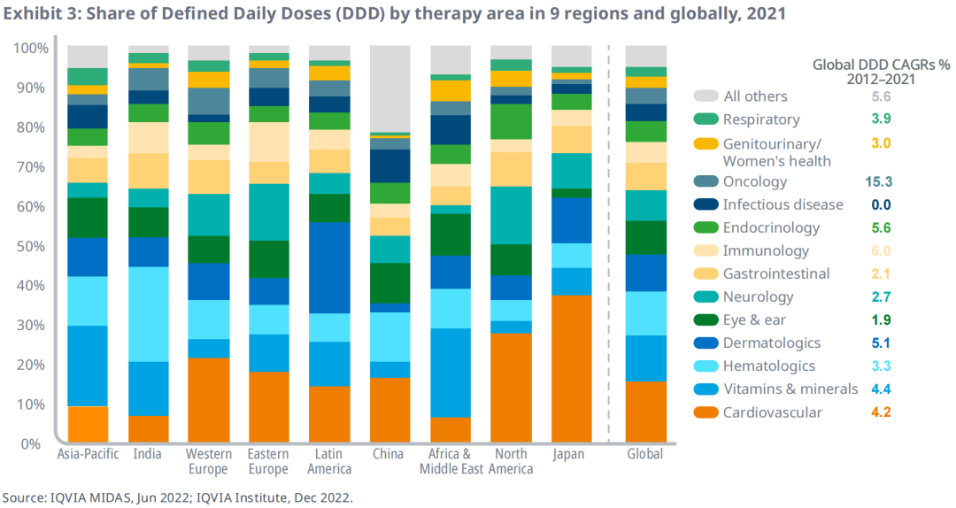 由于全球医疗系统和疾病负担各不相同,因此各地区在使用不同疗法方面表现出显著差异。北美、西欧和日本等平均GDP较高的地区,心血管、内分泌、呼吸和神经病治疗领域的药物使用率明显高于其他地区。虽然在过去十年中大多数主要治疗领域的药物使用量都有所增长,但肿瘤药物的用量远超其他领域,2012-2021年的十年复合增长率为15.3%。