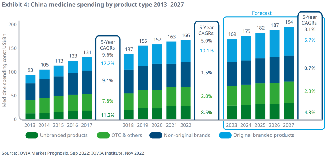 非原研品牌药是中国药品支出的第二大组成部分,由于医院渠道的控费,预计这些药物支出每年的增长不到1%。