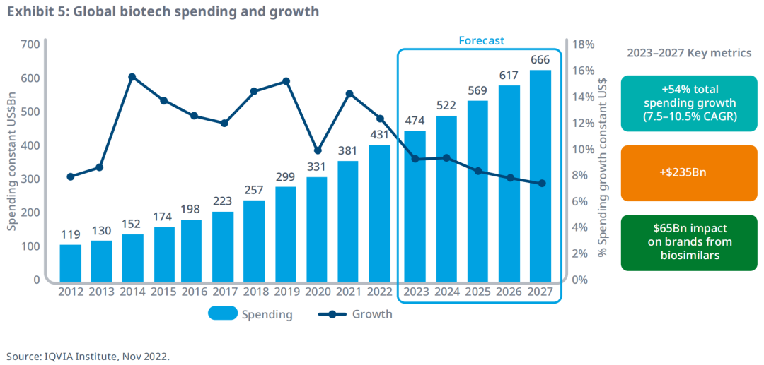 预计到2027年,全球生物药支出将超过6600亿美元,约占全球药物支出的35%,受生物类似药的影响,生物药支出增长将放缓至7.5-10.5%。