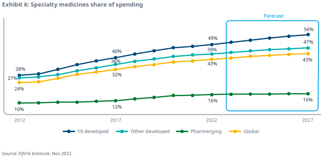 到2027年,预计特药将占全球药品总支出的约43%,占发达市场总支出的56%。