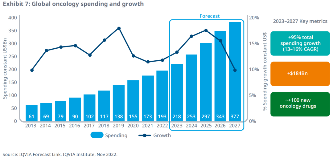 至2027年,全球肿瘤药物支出将达到3700亿美元。由于新药带来的增长会被更多专利到期的影响所抵消,全球肿瘤支出增速较前几年放缓,但仍达到13-16%。未来五年,预计肿瘤药支出总计将增长95%,到2027年共增加1840亿美元。