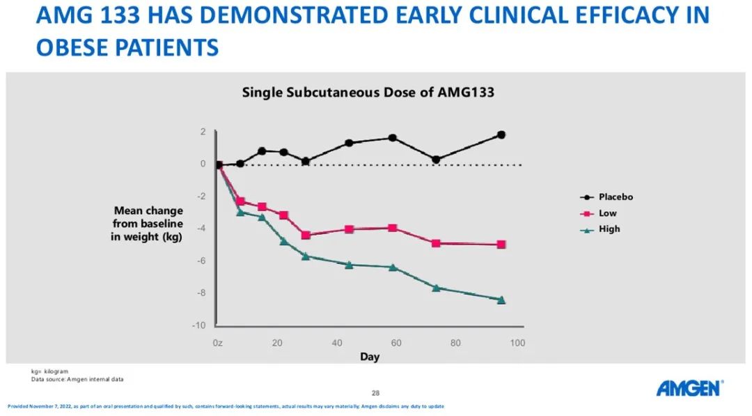 去年12月,安进公布其在研双特异性分子药物AMG 133的最新临床1期数据。AMG 133是一款潜在“first-in-class”的在研抗体多肽偶联药物(antibody-peptide conjugate),能够激活胰高血糖素样肽1受体(GLP-1R)并抑制胃抑制肽受体(GIPR)。初步数据分析显示,肥胖患者在经过12周低或高剂量AMG133的治疗后,体重与基线相较,分别减少了7.2%与14.5%,且病患在停止治疗后,减肥效果仍然很大程度上得到维持。目前AMG133的临床2期试验病患招募已经启动,将在带有(或不带有)2型糖尿病的过重或肥胖患者上,针对AMG 133的疗效、安全性与耐受性作进一步的检视。