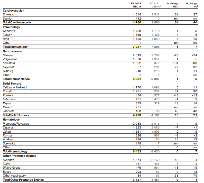 诺华主要聚焦于心血管、免疫学、神经科学、实体瘤和血液学5大核心治疗领域,其对应领域的产品2022年销售额分别是:48亿美元、73亿美元、51亿美元、47亿美元、65亿美元。
