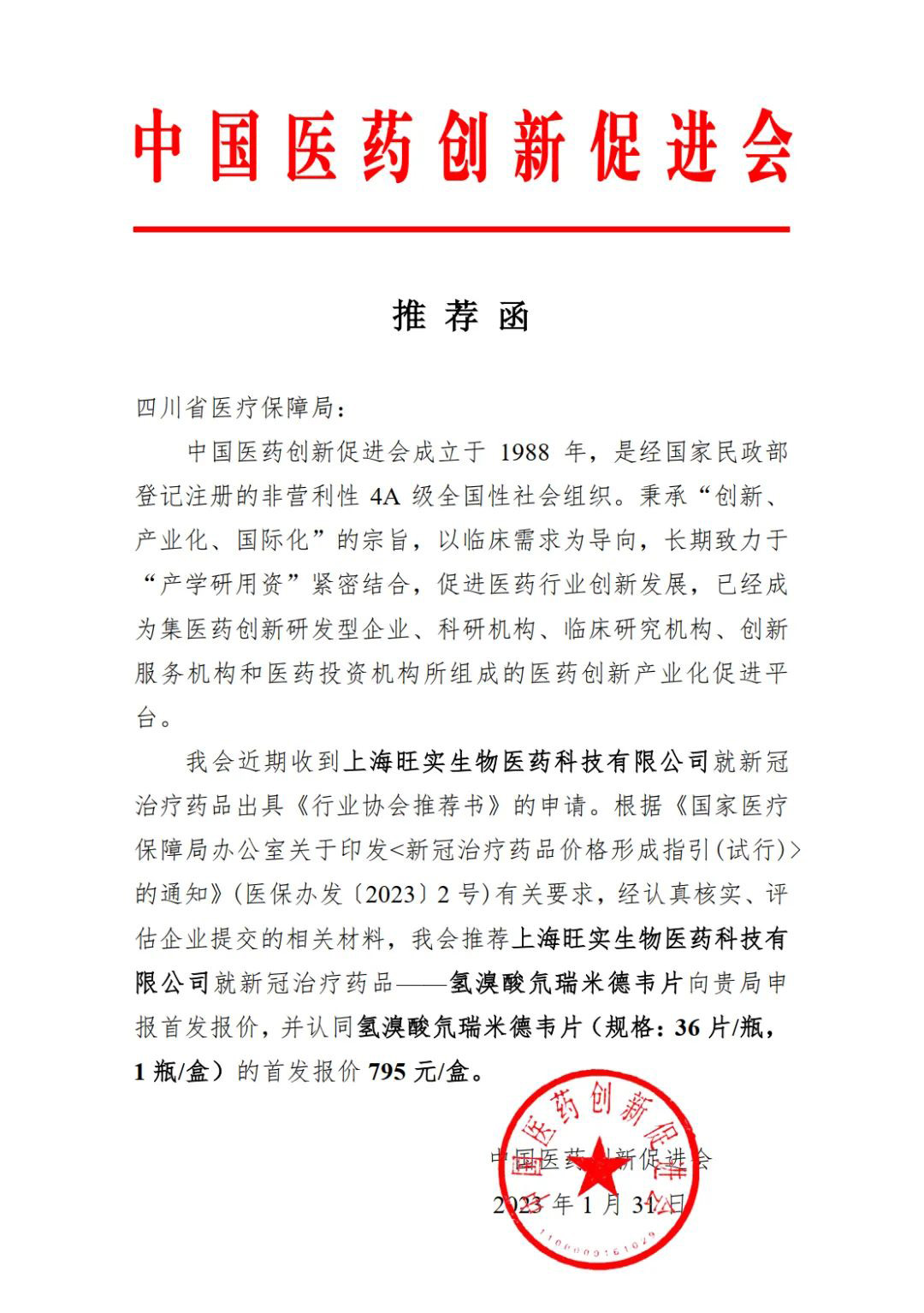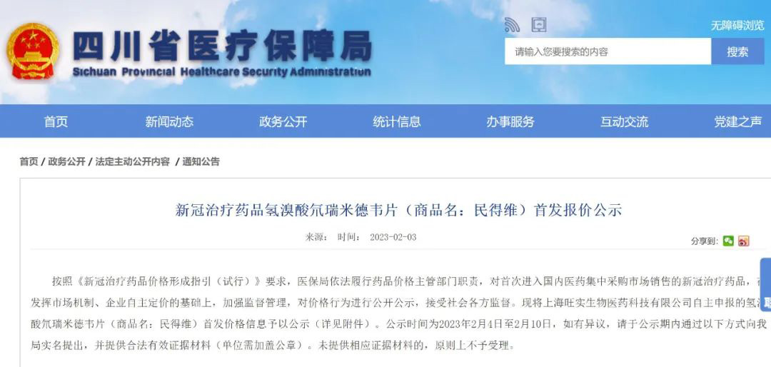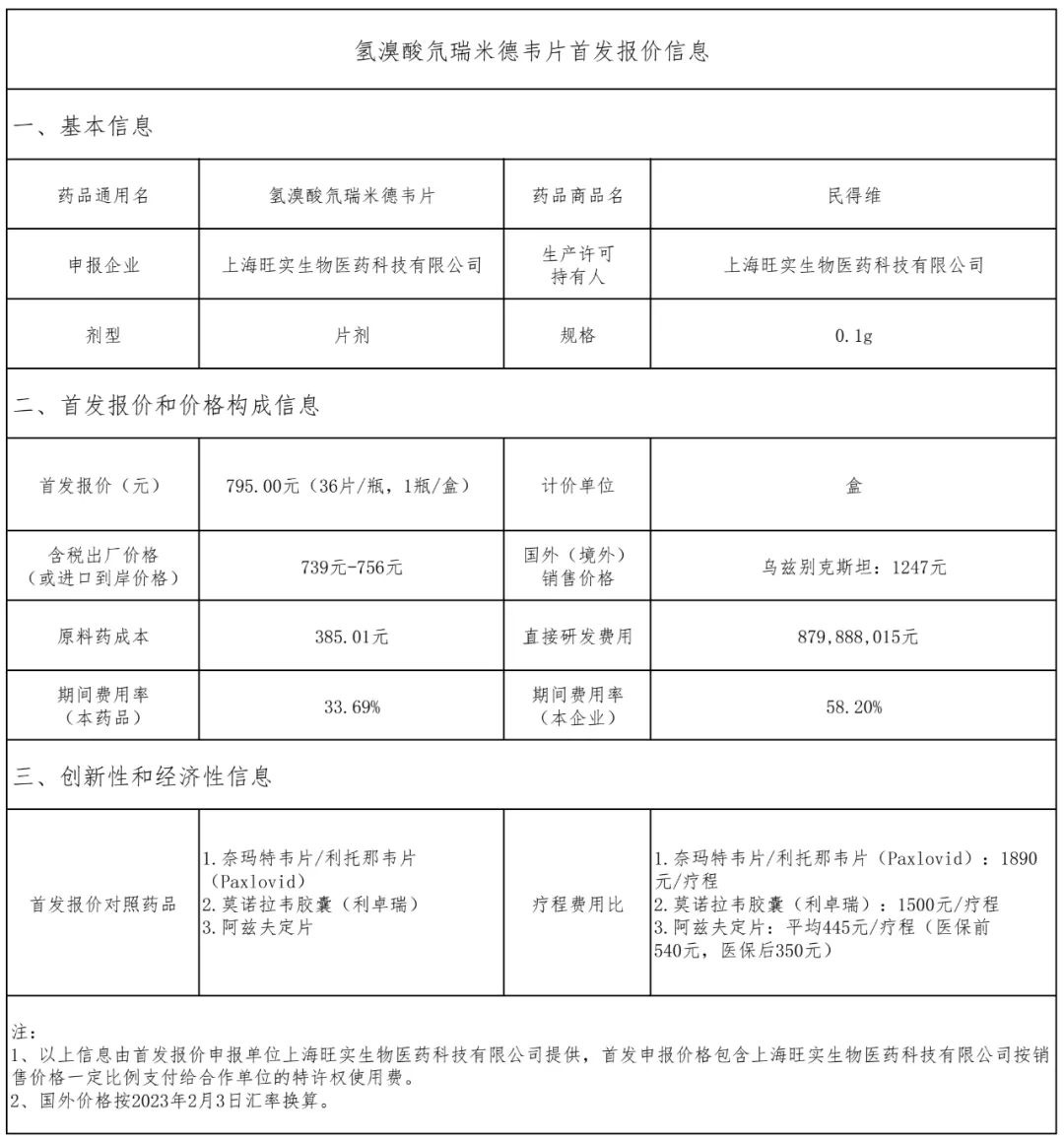 时隔3天,在北京市医疗保障局公示先声药业新冠小分子口服药先诺特韦片/利托那韦片组合包装(商品名:先诺欣)首发报价后,昨日(2月3日),同时获得国家药监局附条件批准的上海旺实生物医药科技有限公司(君实生物旗下企业)的新冠小分子口服药氢溴酸氘瑞米德韦片(商品名称:民得维)在四川省医疗保障局公示了其首发报价,报价为795元/疗程,高于先声药业先诺欣首发报价,先诺欣为750元/疗程。