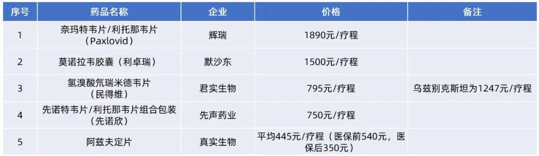 在民得维公布首发报价后,目前国内已获批上市的5款新冠小分子口服药价格从高到低分别为: