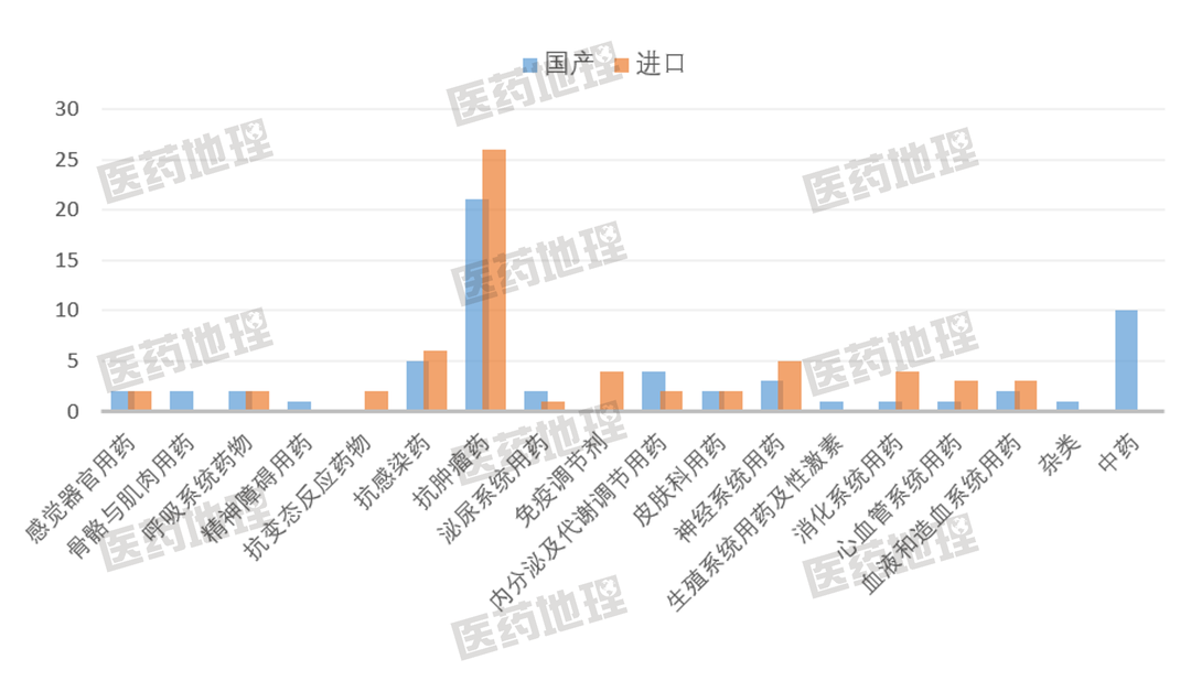 按药品原研公司性质来看,在本年度首次进入III期临床阶段的创新药数量上,本土公司和跨国公司基本上平分秋色,甚至在治疗领域布局方面,也相对一致:取得进展药品数量最多的治疗领域均为抗肿瘤药,其次为抗感染药(图2)。