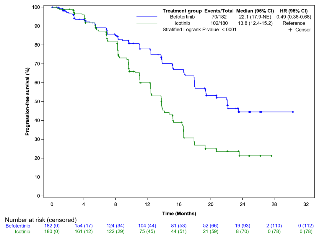 在去年举行的 ESMOAsia 大会中(最新临床试验),贝福替尼对比埃克替尼,在治疗继发性EGFR T790M阳性突变患者的II期临床研究结果表明,在中位随访时间分别为20.7个月和19.4个月时,IRC评估的中位PFS分别为22.1个月(17.9-NE)和13.8个月(12.4-15.2),贝福替尼将疾病进展或死亡的风险降低了51%,目前,其结果已发表在JTO中。