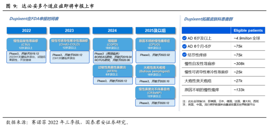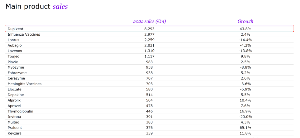 从管线角度分析,最具看点的药还是IL-4Rα抗体Dupixent(达必妥),2022年销售额占到赛诺菲总营收近18.8%,2022年全球销售额达到86.81亿美元(2021年57.8亿美元),位列全球畅销常规用药第九位。
