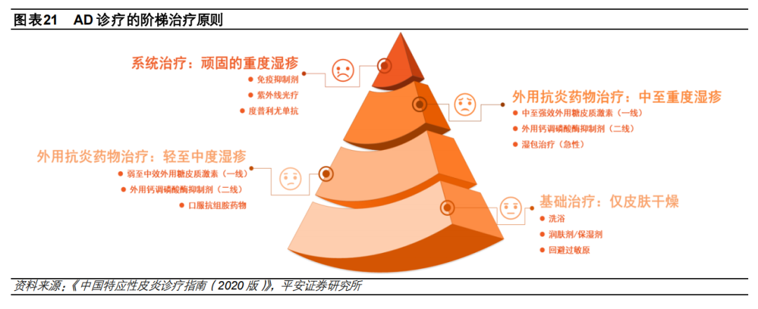 在2020年版的特应性皮炎(AD)诊疗指南中,建议按轻中重度情况来对患者进行阶梯级治疗: