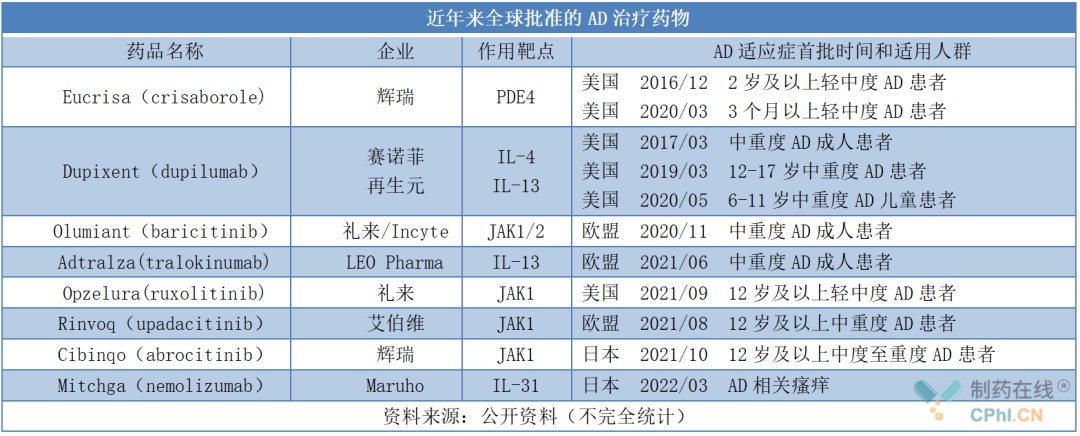 近年来,全球上市了不少AD治疗的靶向新药,以磷酸二酯酶4(PDE4)、JAK抑制剂、Th2通路药物(IL-4 、IL-5、IL-13抗体)为主。
