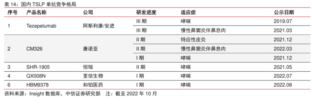 从近期催化剂来看,CM326早在2021年12月进入了临床二期,按一年的随访时间推导,可能有望在近期释放AD临床的相关数据,作为国内最快且率先探索TSLP单抗在AD中的效果的管线,二期数据能否确证其有效性,对于CM326未来在AD领域的成药预期有巨大的影响。反倒是CM326在哮喘领域的成药性,由于Tezspire上市在前,市场没有太大的担心。