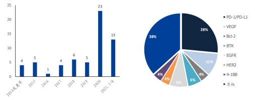 ▲国内药企License-out项目数量(单位:个)和项目靶点分布情况 资料来源:公司公告,国盛证券研究所