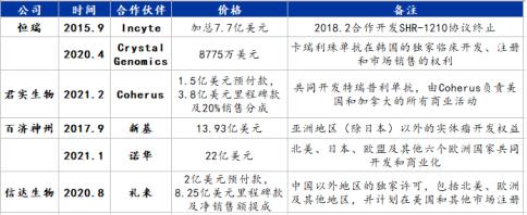 以“抗癌神药”PD-1单抗为例。早在2015年,恒瑞医药便与美国Incyte就PD-1单抗SHR-1210达成7.7亿美元的合作,虽然该项协议在2018年被迫终止,但也实现了中国企业第一次对外转让创新生物药品;2020年,信达生物也将自主研发的信迪利单抗在中国以外地区的独家许可授权给礼来,从而获得累计超10亿美元款项。