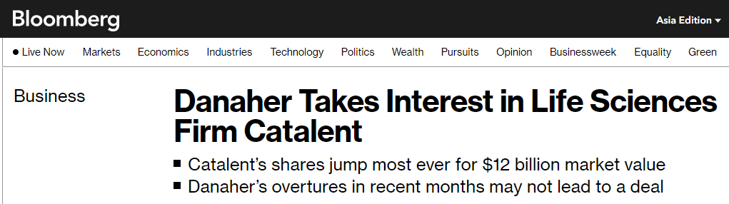 2023年2月6日,据彭博社报道,美国丹纳赫公司(Danaher Corporation)表示有兴趣收购CDMO巨头Catalent。