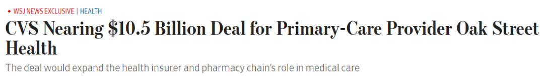 2023年2月6日,据华尔街日报报道,美国最大药品零售商CVS Health打算以105亿美元收购初级保健中心运营商Oak Street Health。