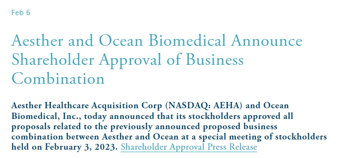2023年2月6日,SPAC Aesther Healthcare Acquisition Corp.股东已批准该公司与生物制药公司 Ocean Biomedical 的合并计划。