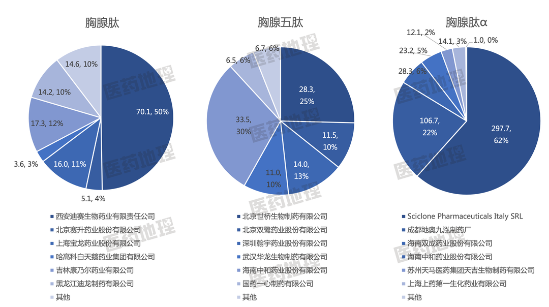 图3: 2021年胸腺肽、胸腺五肽、胸腺法新top企业(单位:百万元)数据来源:中国医药工业信息中心 PDB药物综合数据库