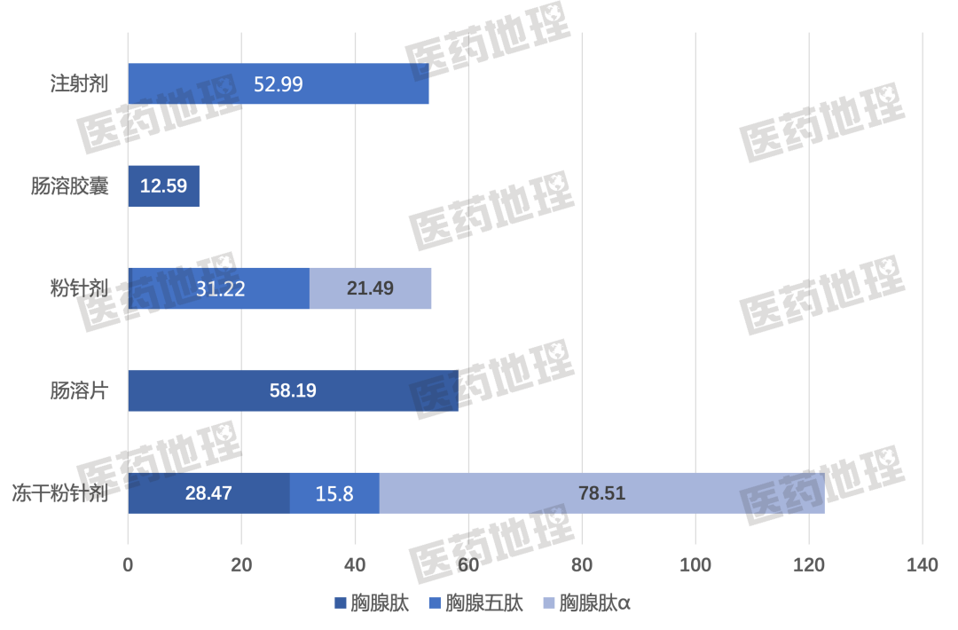 图4: 2021年胸腺肽、胸腺五肽、胸腺法新剂型分析(单位:百万元)数据来源:中国医药工业信息中心 PDB药物综合数据库